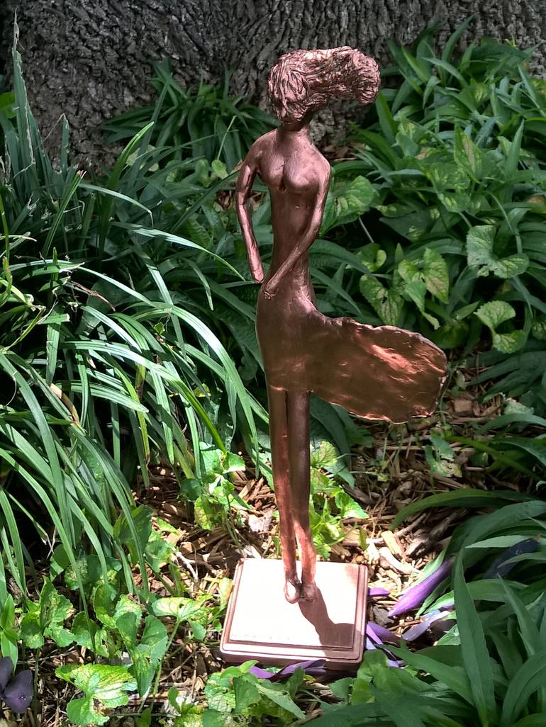 Photographed in a lush garden setting this epoxy clay work is clad in copper metal paint with an applied green patina. A wooden base and an aluminum and interior wire armature support her. This is a lovely piece that feels almost animated. She stands just over 21 inches; accentuating her long, sle...