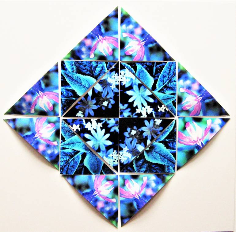 This is a photo montage a constructed photograph. Each triangle is gently curved and attached to the backing card , I am currently working on a series of plant based images, and have used photographs of Woodruff, Comfrey, and red Campion. The pattern is based on geometrical symmetry that is foun...