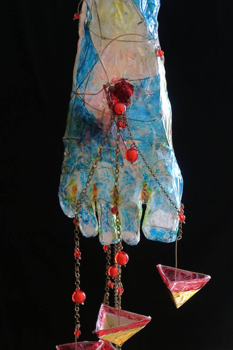 Holly foot is an image representing jesus right foot while he was in the cross, alive, pouring blood from the wound caused by the nail. The blood is being contained in small golden xalices. In the top, a Moebius strip is the halo representing the infinte has writen Salvé and the symbol Chi-Rho.