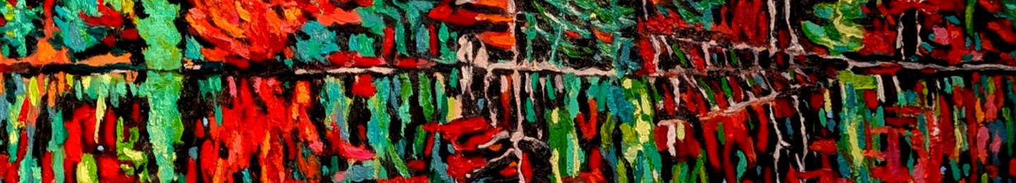 Her work has evolved from abstracts to her current explorations in colourful impressionistic landscapes.